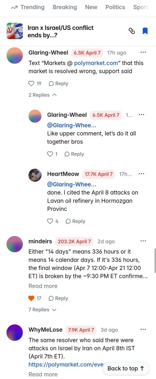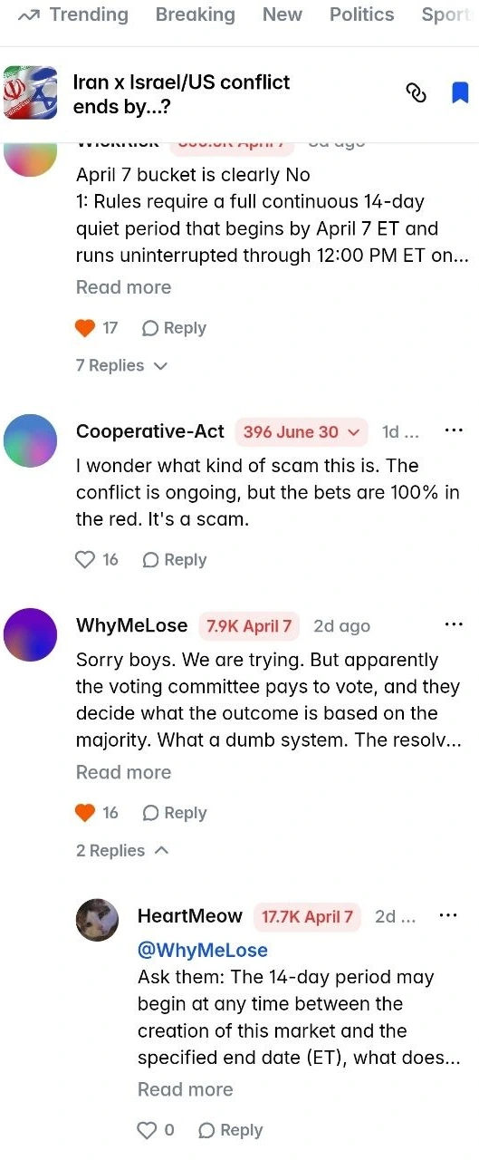 Then came the rule stretch. Polymarket says a second dispute can escalate to UMA’s token-holder review, and the April 7 market now shows two proposed “Yes” outcomes, two disputes, and “Final review” — the exact sequence the escalation path was designed for, and one that hands final say to a voting process rather than to any single arbiter. The rules say a “Yes” outcome requires a continuous 14-day period without qualifying military action, beginning by the specified end date and lasting through noon ET on the 14th calendar day. Critics argue there is only one way to force that result, given what actually happened on the ground: pretend April 7 counts as a quiet day, collapsing the “calendar day” requirement into something closer to “part of a day” and silently shaving hours off the 336-hour window the rules themselves construct.